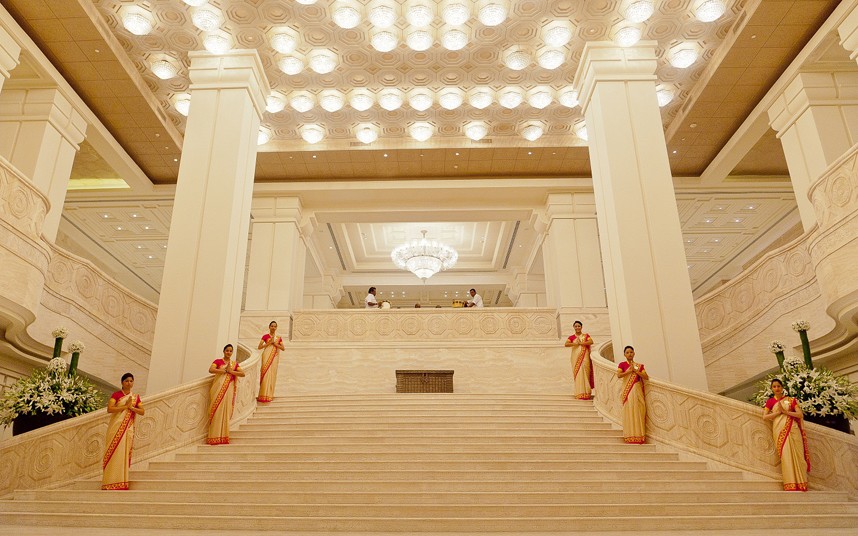 Admittedly the lobby of the ITC Grand Chola hotel in Chennai would look less impressive without a procession of elegant, sari-clad staff members lined in greeting, but it is an imposing space nonetheless. Gleaming marble abounds in the lobby, and the hotel as a whole features one million square feet of hand-carved marble.